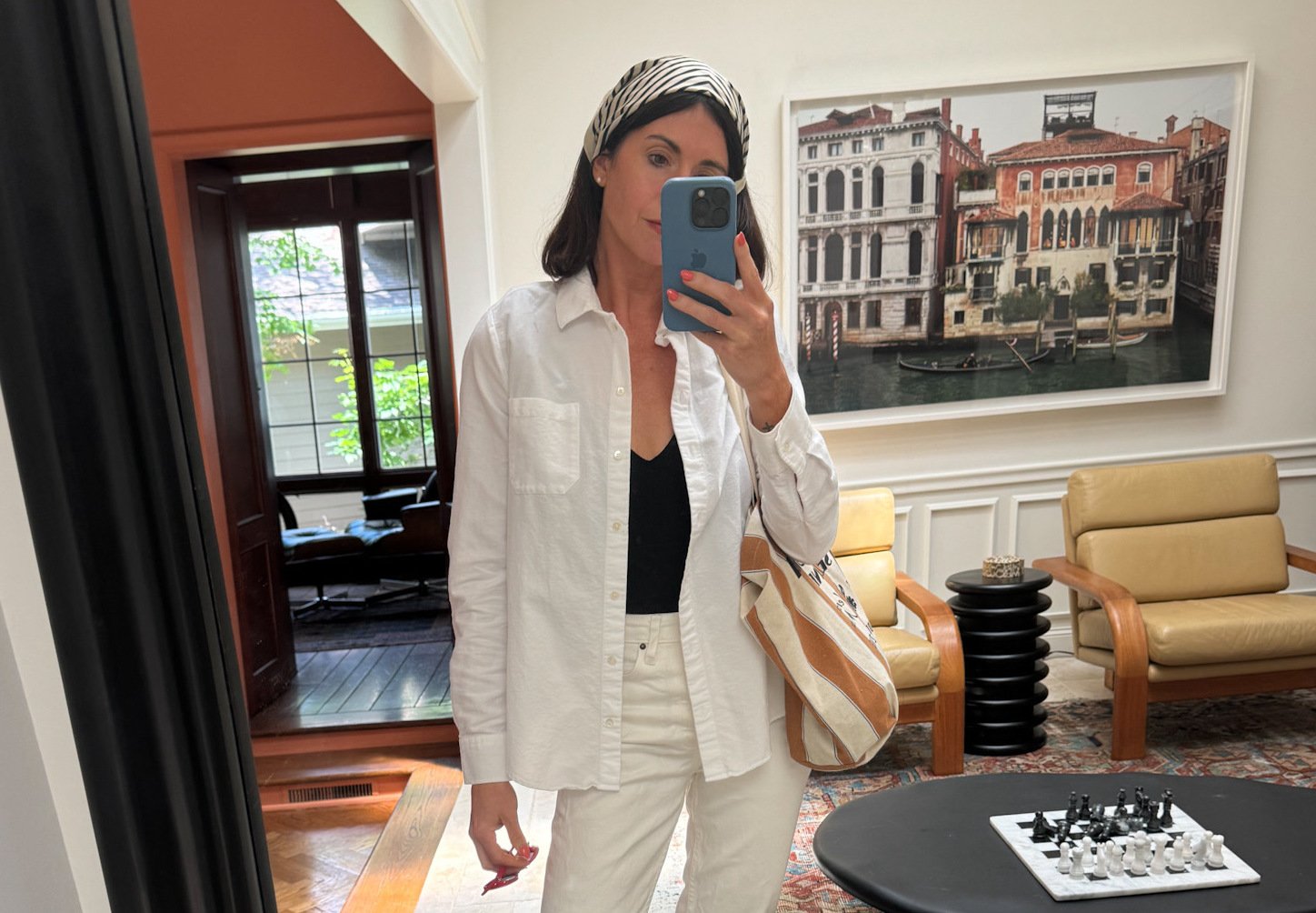 En uno de sus sencillos conjuntos de verano, una mujer lleva unos vaqueros color crema, una camisa blanca abotonada, un traje de baño negro, chanclas negras y un pañuelo en la cabeza blanco y negro.En uno de sus sencillos conjuntos de verano, una mujer lleva unos vaqueros color crema, una camisa blanca abotonada, un traje de baño negro, chanclas negras y un pañuelo en la cabeza blanco y negro.