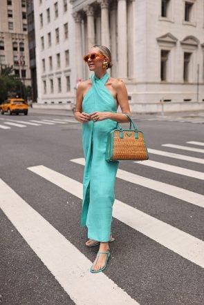 Desde que me enamoré de Esta cámara de Julia Amory ¡El verde azulado ha estado en mi mente! Opté por usarlo con todos los accesorios verde azulado y dorado, pero este vestido asimismo luciría espectacular con toques de rojo o naranja. Incluso combiné recientemente el verde azulado con rojizo (gastado aquí) ¡Si buscas más ideas de estilo, sigue leyendo para ver todos mis últimos hallazgos en verde azulado y turquesa para el verano!
