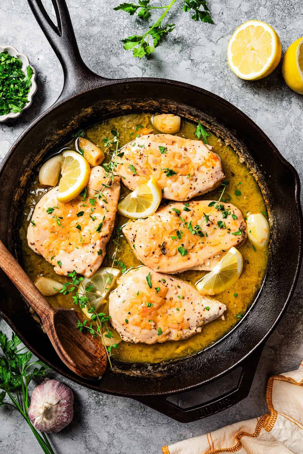 Vista aérea de un filete de pollo servido en una sartén grande con salsa, adornado con rodajas de limón y perejil fresco.